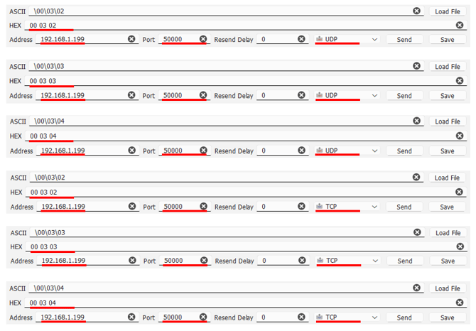 ii. 상위 주소(Upper Address) **“192.168.1.199”**은 PC의 IP 주소입니다. (PC에 설정된 주소의 마지막 자리 “199”을 임의로 변경하여 사용하십시오.)iii. 전송 포트(Transmit Port)는 **“8890”**으로 설정합니다.