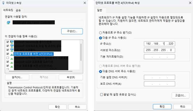 💡 컴퓨터의 이더넷 어댑터를 임시로 고정 IP로 변경하되, 센서와 동일한 앞 세 개의 필드를 사용합니다. 예를 들어 192.168.1.220으로 설정합니다.