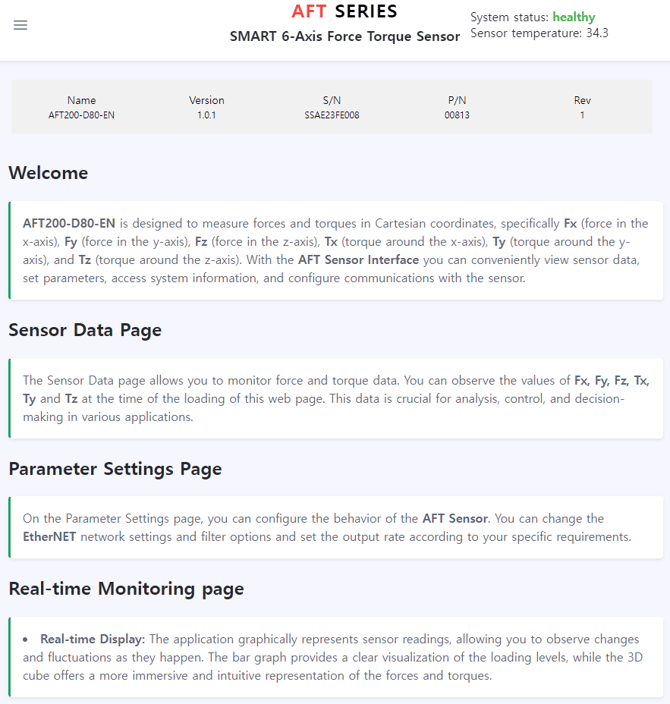 사용자가 브라우저 주소창에 센서의 IP 주소를 입력하면, 이더넷 F/T 환영 페이지(Welcome page)가 나타납니다. 환영 페이지에서는 AFT200-D80-EN 센서의 주요 기능 개요를 확인할 수 있으며, 페이지 하단에는 현재 구성에 사용된 보정(Calibration) 정보가 표시됩니다.