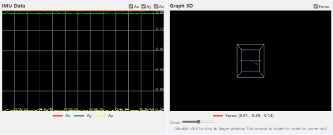 왼쪽에는 F/T 값과 가속도(Acceleration) 값이 표시되며, 아래에는 가속도 값과 힘 벡터 방향이 나타납니다.