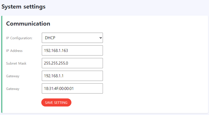- DHCP의 경우, 콤보 박스에서 DHCP를 선택한 후 페이지 하단의 “SAVE SETTING” 버튼을 클릭합니다. 설정이 성공적으로 저장되면, 페이지 아래에 “Set IP to DHCP successfully. Auto reboot device.” 메시지가 표시됩니다.